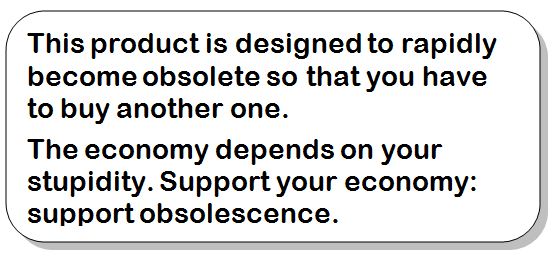 To all intents and purposes, London’s policy idea has been implemented wholesale, although instead of the “duly appointed governmental agency” carrying out the destruction, ordinary people entranced by the consumer culture do it themselves via their trash, recycling bins and domestic tips; insurance companies and their property development partners do it spontaneously by demolishing old buildings and constructing new ones in their place; vehicle manufacturers do it systematically by offering us trade-ins for old cars and trucks, to be replaced by shiny new models. The corporate controlled governments of the modern civilized world can just sit back and enjoy the fruits of the Planned Obsolescence machine they put in operation, occasionally making the odd tweak to keep us replacing things at the correct rate. So what can we do about this that isn’t already obvious?